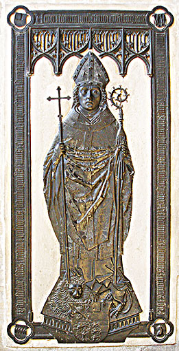 Über dem Haupte der Figur befinden sich Verzierungen im Spitzbogenstyle auf der Vierung sieht man obige sehr schöne, altdeutsche Kirchenschrift, an den Ecken die Agnatenwappen. Quelle: Der Dom zu Bamberg mit seinen Denkmälern, Inschriften Wappen und Gemälden von M.Landgraf 1836 |