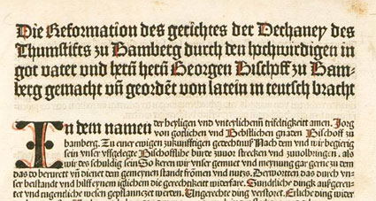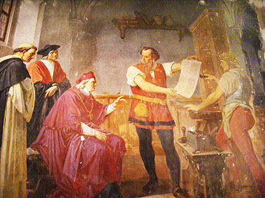 Ein Fresko das Bischof Georg 1461 mit seinem Buckdrucker Pfister zeigt gemalt von Rothbart. Auschnitt aus seinen ersten Buch im Wiegendruck |